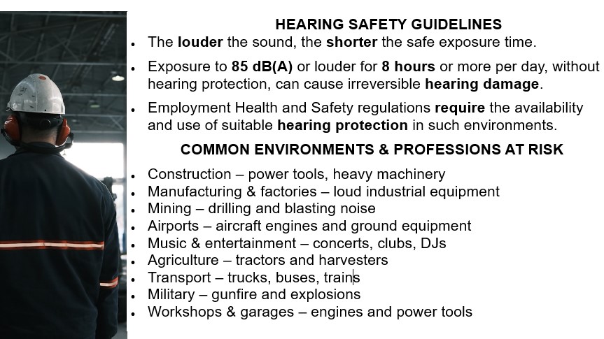 The risk of noise-induced hearing loss is preventable with the use of good and suitable hearing protection, and by limiting exposure to damaging noise levels. Prevention is always better, and generally cheaper, than "cure". The risk of damage due to loud noise or sound depends primarily on how loud noise or sound is, how long and how often one is exposed to it. The louder, the less time one should spend being exposed to it to minimise the risk of noise-induced hearing loss. Find out more about hearing protection here.