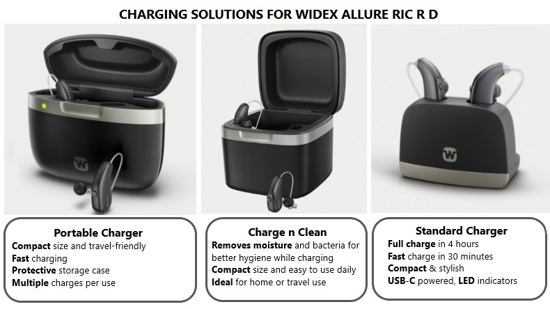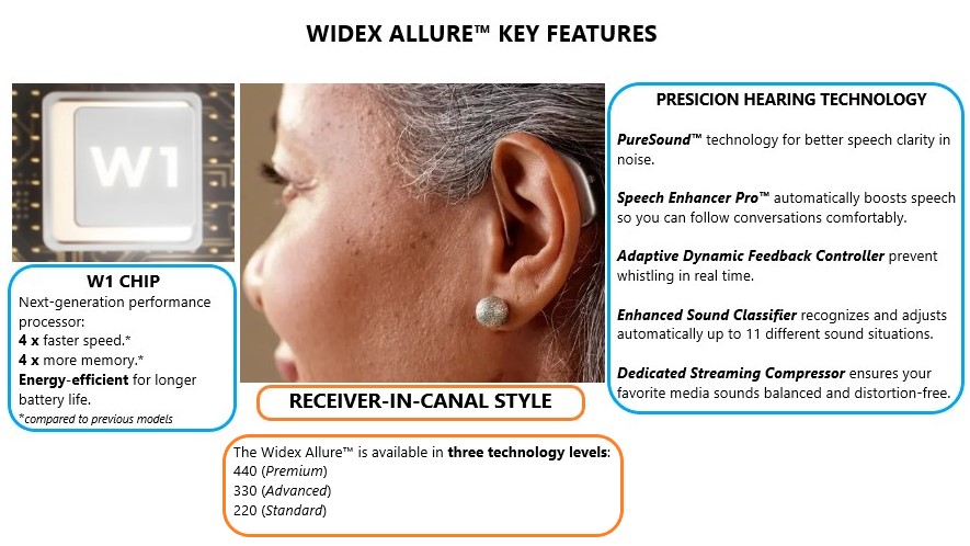 Widex Allure™ is a rechargeable receiver-in-canal (RIC) hearing aid powered by the W1 chip, delivering natural, clear sound, enhanced speech clarity, adaptive feedback control, and automatic sound adjustments for effortless hearing in any environment.
